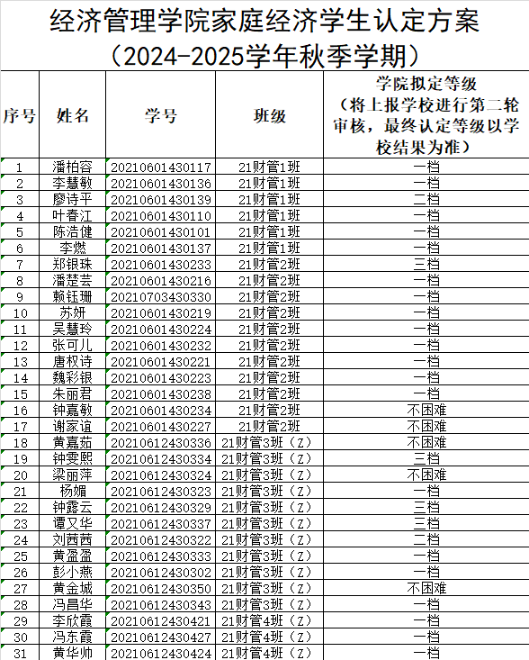 根据《关于做好2024年秋季学期家庭经济困难员工认定工作通知》(广州理工学助函(2024)13号),经员工本人申请以及班级、公司评审小组评议,现将公司2024年秋季学期家庭经济困难员工认定等级结果(此名单中的贫困等级仅是公司初审拟定结果,最终贫困等级结果以公司审核上报全国员工资助信息系统后由系统判定的贫困等级为准)在此予以公示。