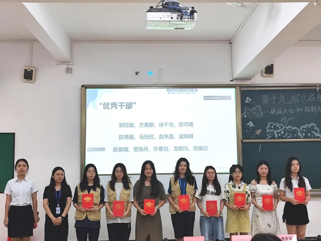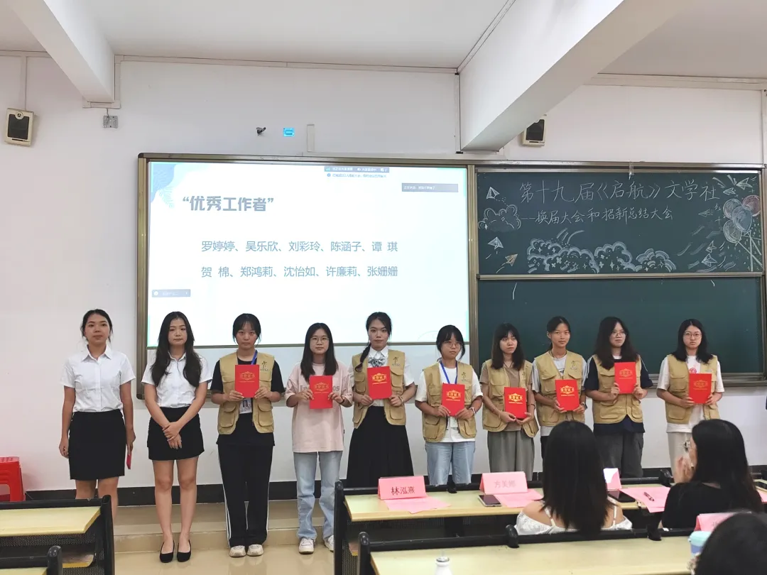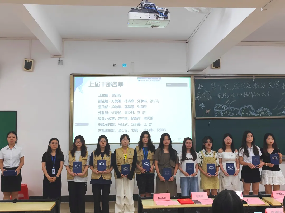 此次大会上共颁发了23份荣誉证书以及21份聘书。其中,罗婷婷、吴乐欣等10人获得了“优秀工作者”的荣誉证书;郭钰璇、方美娜等13人获得了“优秀干部”的荣誉证书。郭钰璇、方美娜、林泓熹等21人被授予《启航》文学社第十八届干部聘书。在接下来公布的《启航》文学社第十九届干部任命名单中,苏可晴、杨舒萍、龙柳汛、许春怡、郭晨曦分别担任正副主编的要职。而在五大部门干部任命中,分别是:编委办公室部长兼财务总监吴乐欣,副部长罗婷婷、叶敏;记者编辑部部长李晓琳,副部长张珊珊、李玉华、梁紫媚;出版发行部部长陈涵子,副部长谭琪、许廉莉;宣传部部长李宇,副部长梁炜琪、贺棉;外联部部长曾焕丹,副部长沈怡如、姚美欣。