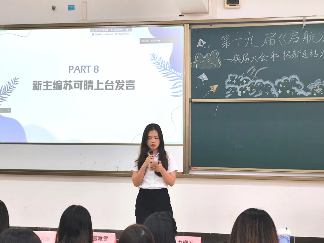 第十九届《启航》文学社主编苏可晴师姐发言,她表示成为《启航》文学社的新主编深感责任重大,她对未来的工作充满了期待和信心。在文学创作方面,她希望成员们能够继续保持对文学的热爱和执着,鼓励每一位社员都积极投入到创作中。对于社团的刊物出版工作,她表示会严格把关每一篇稿件的质量,确保刊物的高品质和独特风格。她相信,只要全体社员齐心协力,《启航》文学社一定能够在未来的日子里焕发出更加耀眼的光芒!