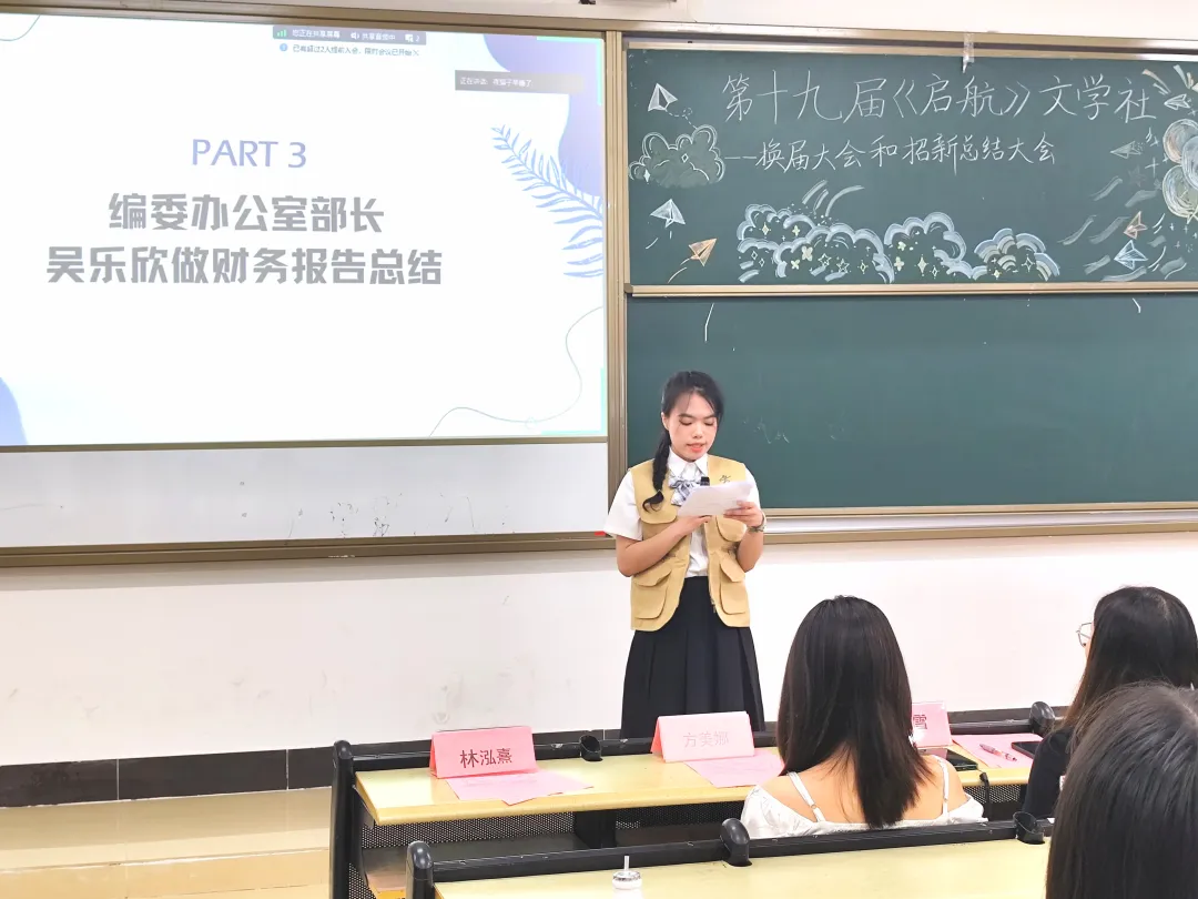 编委办公室部长吴乐欣发言,她强调了财务工作的重要性。在老师的领导下,同学们应将《启航》的有限资金进行合理安排,始终服务于同学,杜绝贪污、挪用经费等不良现象的发生。她详细汇报了《启航》文学社上一年的经费收支情况,表示每笔收支都严格执行bevictor伟德官网《启航》文学社财务管理制度规定的标准,无不明资金的收入或支岀。她希望大家强化财务预算,多方面争取资金,更好地发展《启航》文学社!