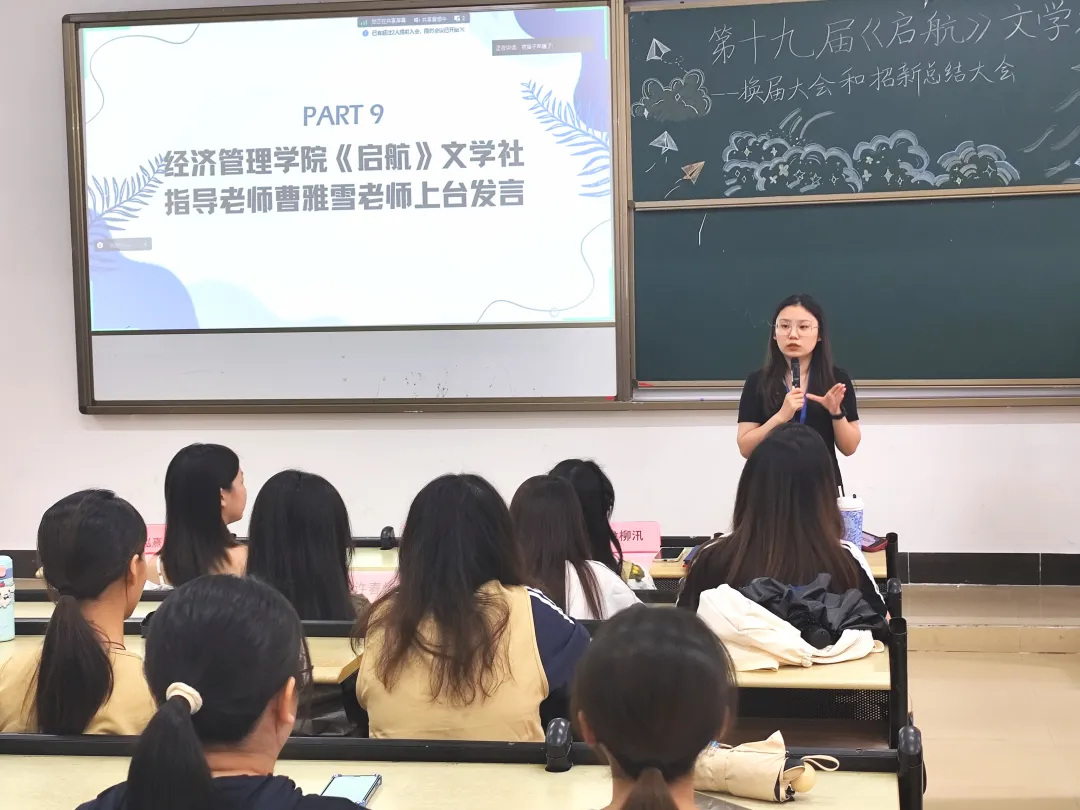 指导老师曹雅雪老师回顾了上一学年各部门的工作成果,包括书海寻韵活动和读书报告分享大赛等活动。她肯定了成员们的付出,并强调了期刊工作的重要性,她期待新老成员共同参与,打造高质量的文学作品。同时她鼓励大家提出新点子来举办更多活动。她希望成员们能保持对文学的热爱,并在日常生活中维持阅读习惯,和她一起阅读,获得更多启发。她也期待大家能够通过见面和交流,共同推动《启航》文学社的发展!