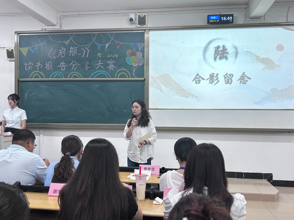 指导老师曹雅雪上台发言,曹老师首先对参赛选手的认真准备、评委老师的精彩点评、《启航》同学的努力筹备、观众小伙伴的热情表示感谢,接着曹老师表示被各位同学在分享中表现出的或活泼可爱、或一身正气、或温柔坚定、或激情昂扬所打动,期待后续能够有更多机会见到大家精彩表现。同时,她也指出大家在报告准备以及分享中的不足,分享比赛技巧,激励选手继续进步。曹老师讲到,《启航》文学社承担着公司文化建设与传播的使命,指引和鼓励每一位经管学子在文学道路上前进,同学们每一次勇敢的分享都应该被重视、被奖励。在未来,《启航》文学社将提供更多的机会和平台让大家展现自己。最后,曹老师鼓励大家多阅读、常分享,和作者、读者、书中的人物、书中的风景共处,期待大家都能够从书中有所得、有所获!