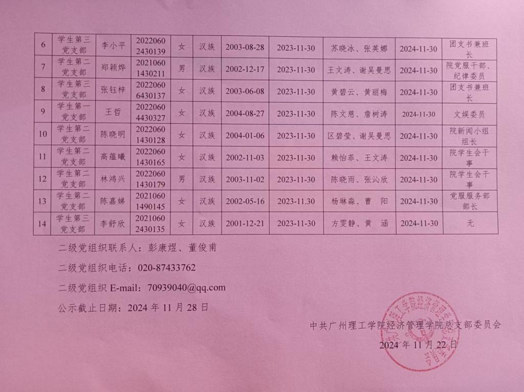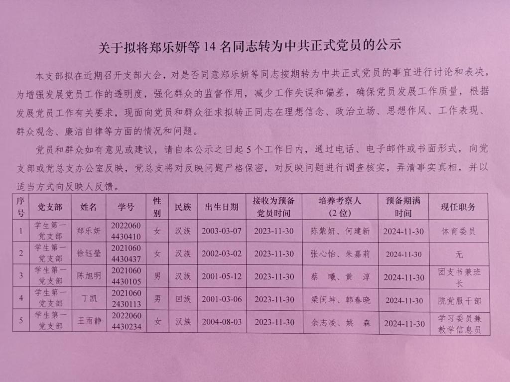 本支部拟在近期召开支部大会,对是否同意郑乐妍等14名同志按期转为中共正式党员的事宜进行讨论和表决,为增强发展党员工作的透明度,强化群众的监督作用,减少工作失误和偏差,确保党员发展工作质量,根据发展党员工作有关要求,现面向党员和群众征求拟转正同志在理想信念、政治立场、思想作风、工作表现、群众观念、廉洁自律等方面的情况和问题。