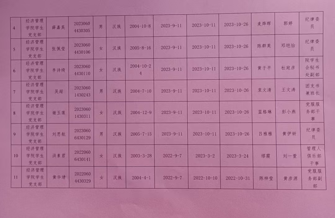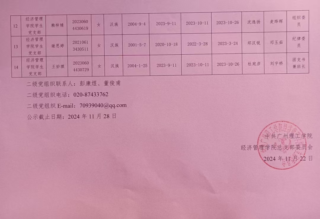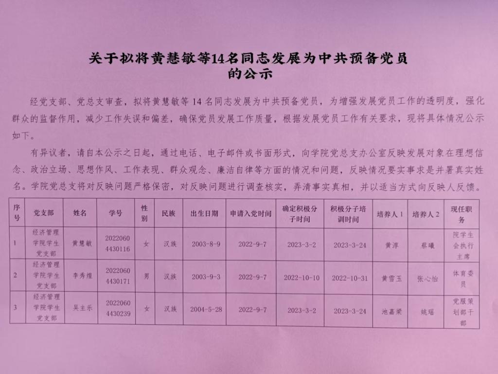 经党支部、党总支审查,拟将黄慧敏等14名同志发展为中共预备党员,为增强发展党员工作的透明度,强化群众的监督作用,减少工作失误和偏差,确保党员发展工作质量,根据发展党员工作有关要求,现将具体情况公示如下。