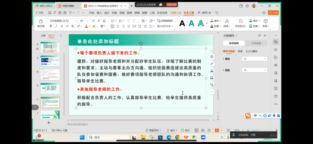 会上,陈少英副经理详细解读了第十二届“学创杯”全国老员工创业综合模拟实训活动及2025年全国企业竞争模拟大赛的赛程安排与核心要求。她指出,两项赛事是深化创新创业教育、培养员工实践能力的重要平台,需“以赛促学、以赛促强”,通过竞赛反哺教学改革与人才培养。结合往届经验,她进一步明确了赛项负责人及教师团队的职责分工,细化备赛时间节点与资源调配方案,要求各团队强化协作、高效推进指导工作。