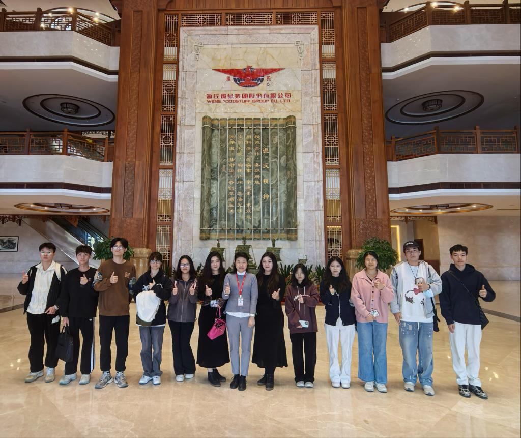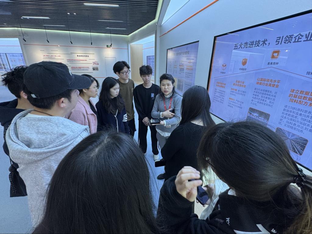 在温氏集团相关负责人的陪同下,师生参观了温氏展厅,了解了企业发展史、智能化生产车间、食品加工检测平台及数字化管理系统。温氏集团作为国内领先的农牧食品企业,其“公司+农户”全产业链模式和智能化生产流程为员工提供了丰富的实践案例。座谈会上,集团研究院黎鸿彬经理细介绍了温氏在智慧养殖、食品深加工等领域的技术创新成果。