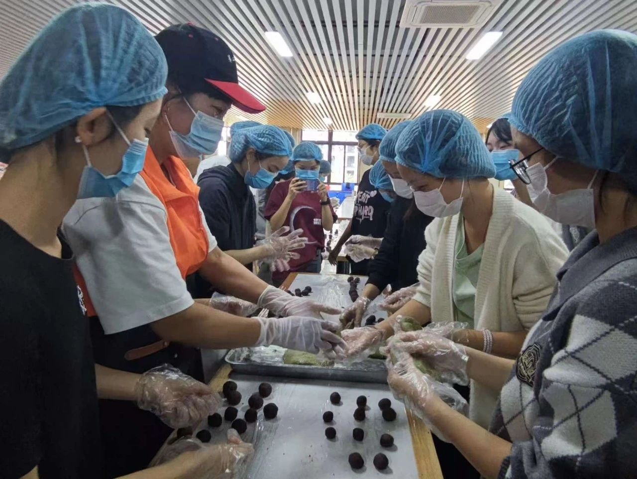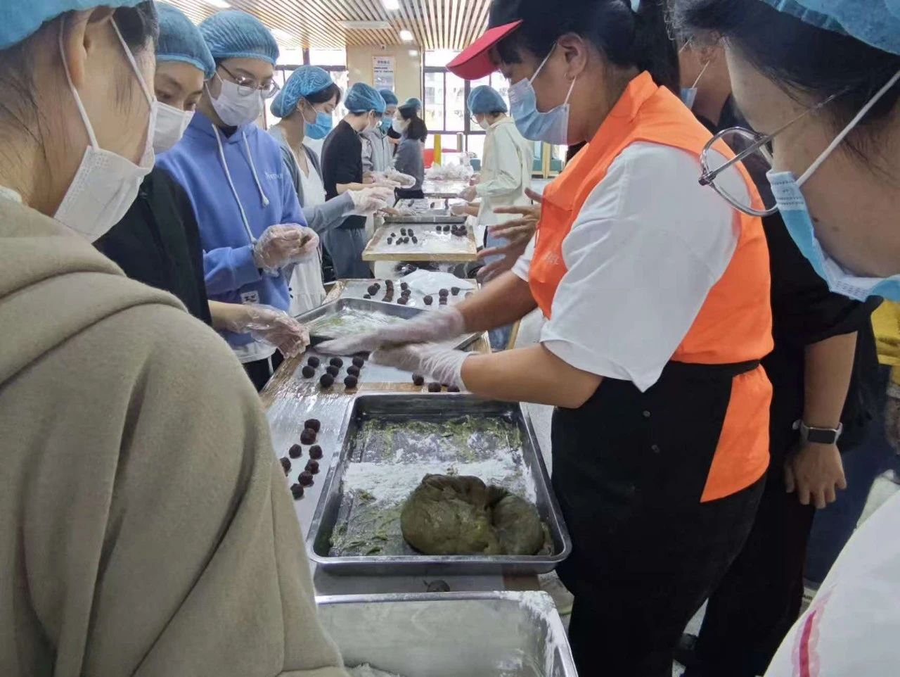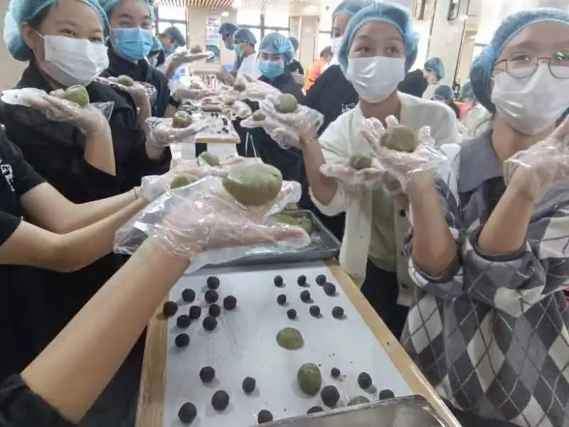 在活动中,同学们不仅要清洗艾草、榨艾草汁、糅合面团,还要制作红豆馅料。经过食堂工作人员们耐心的指导,同学们制作出一个个圆糯又可爱的青团。