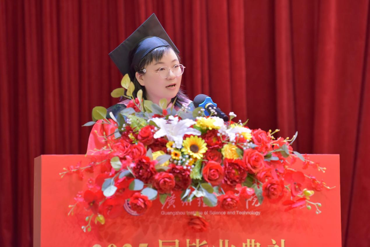 张海燕老师作为教师代表发言。张老师向全体毕业生送上最诚挚的祝贺,恭喜你们顺利完成学业,即将踏上人生新的征程!她深情回顾了四年来与同学们共同成长的点点滴滴,从课堂上的互动到课后的交流,从学术竞赛到社会实践,每一个瞬间都充满了温暖与感动。她勉励毕业生们,要脚踏实地,将所学知识运用到实际工作中,勇于担当,在工作中展现经管学子的专业素养。张老师的谆谆教诲,让在场的每一位毕业生都深受触动。
