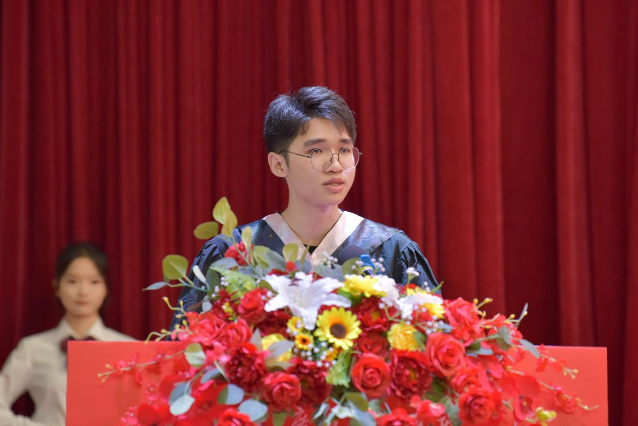 在毕业生代表发言环节,21国贸1班的刘志雄同学深情回顾了四年的老员工活。他动情地说道,这四年,是我们在经管公司成长蜕变的四年。从青涩懵懂到成熟自信,从对专业知识的陌生到熟练掌握,每一步都离不开公司领导和老师的辛勤培育。他代表全体毕业生向公司领导和老师们表达了最真挚的感谢。作为优秀毕业生代表,刘志雄分享了自己在校期间专业学习和实践锻炼的收获与体会,他表示,母校给予的不仅是知识,更是成长的勇气和力量。我们将永远铭记这份培育之恩。展望未来,刘志雄坚定地说道,全体毕业生必将秉承校训精神,脚踏实地、锐意进取,在各自岗位上用实际行动回报母校和社会。他代表全体毕业生祝愿母校桃李芬芳,再创辉煌,现场响起一片热烈的掌声。
