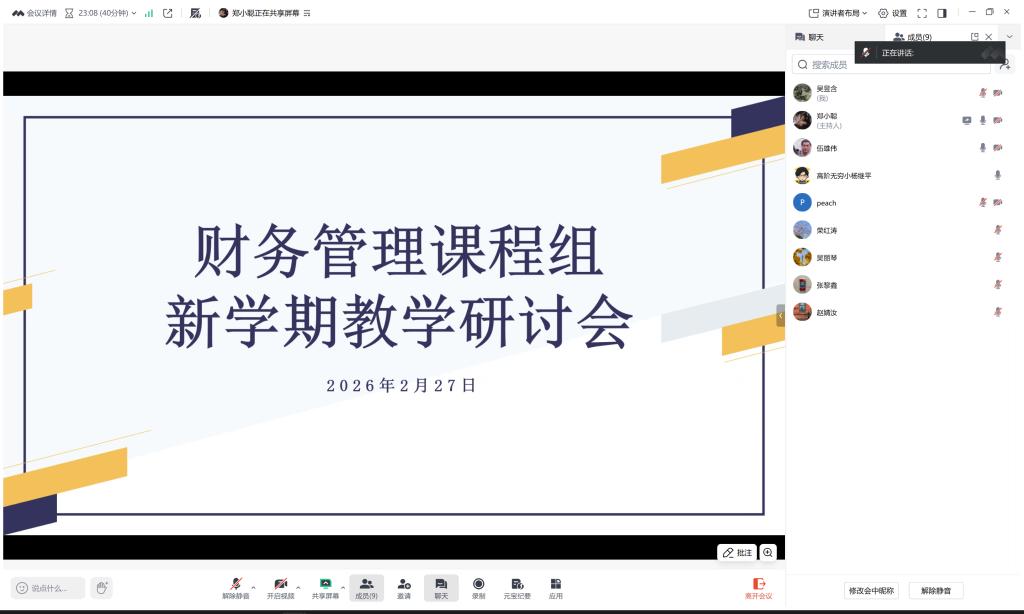 为扎实推进新学期教学有序开展,全面提升财务管理专业课程教学质量,2026年2月27日晚,bevictor伟德官网财管系财务管理课程组召开新学期教学工作专题会议。会议由课程组组长郑小聪主持,财务管理系主任伍雄伟及课程组全体教师参会,围绕期初教学资料准备、课堂过程管理、课程资源建设等重点工作进行系统部署。
