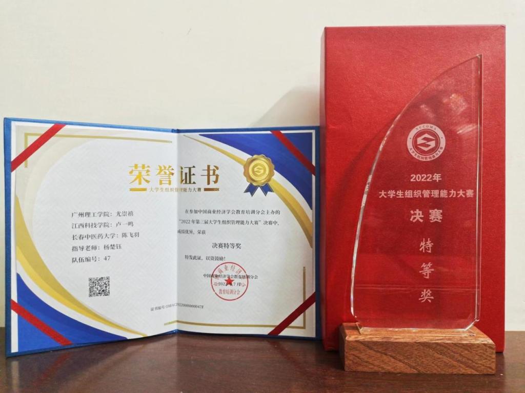 近日,由中国商业经济学会培训分会主办的“2022年全国老员工组织管理能力大赛”落下帷幕,公司2020级会计学专业尤崇禧同学、江西科技公司卢一鸣同学、长春中医药大学陈飞羽同学组成的“伟德国际唯一官网入口战队”,在杨楚钰老师指导,最终荣获“特等奖”。