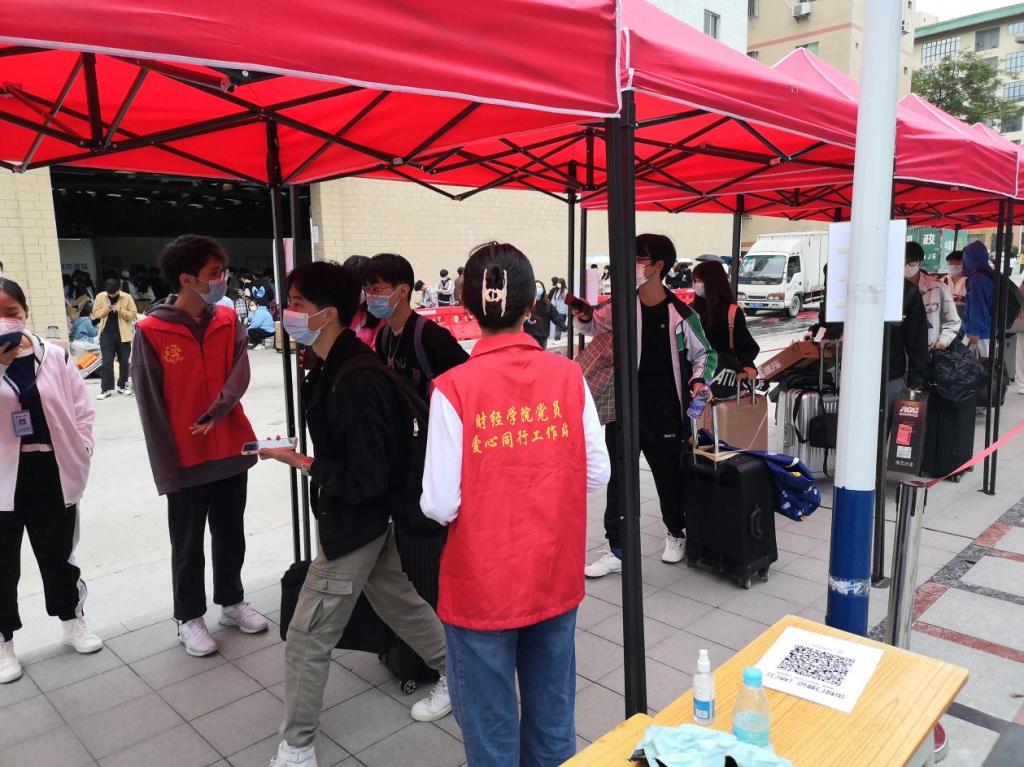 在上车点处,志愿者和老师们严格遵循防疫要求,组织同学们有序上车,合力帮助同学们搬运行李,确保同学们安全离开校园。行李物资的传递,是心与心的相贴,心手相牵,守望相助,秋天的凉意也在这样的温暖中消融了。