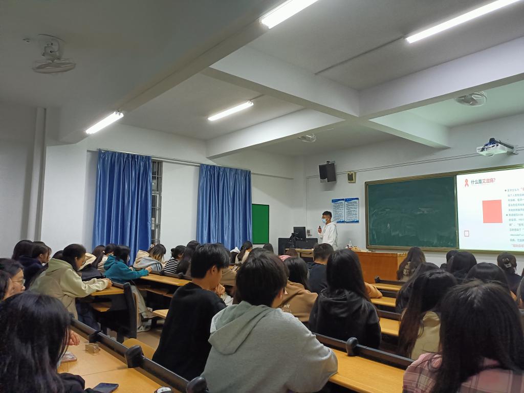 接着,辅导员介绍了艾滋病的传播途径有性交传播、血液传播、共用针具、母婴传播、泪液传播。而和艾滋病患者握手、一起吃饭以及蚊虫叮咬是不会传播艾滋病的。艾滋病共有四期症状,一是急性感染期:病人发热、皮疹、淋巴结肿大、还会出现乏力、出汗、恶心、呕吐、腹泻、咽炎等;二是潜伏期:艾滋病的平均潜伏期是2-10年;三是艾滋病前期:病人已具备了艾滋病的最基本特点,即细胞免疫缺陷,只是症状较轻而已;四是典型的艾滋病期:艾滋病的终期,免疫功能全面崩溃,病人出现各种严重的综合病症,直至死亡。
