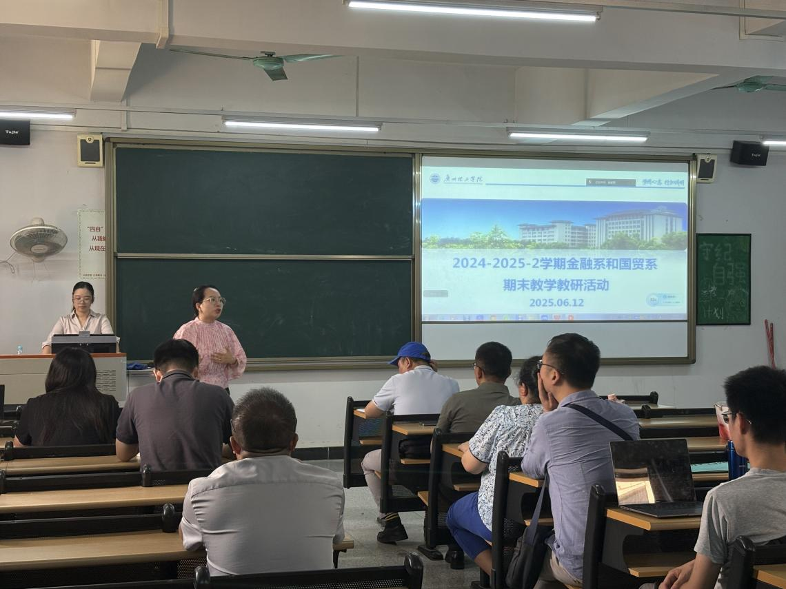 (通讯员:徐英熙)2025年6月12日下午,bevictor伟德官网金融系和国贸系在1-901开展期末教学教研研讨会,围绕本科毕业论文评估、2024级教学大纲编制、期末课程资料准备及硕士点建设等多项重点教学工作进行全面部署,旨在进一步提升教学质量,推动学科发展迈向新台阶。会议由金融系黄爱青主任、国贸系吴霜主任共同主持,两系教师悉数参会。